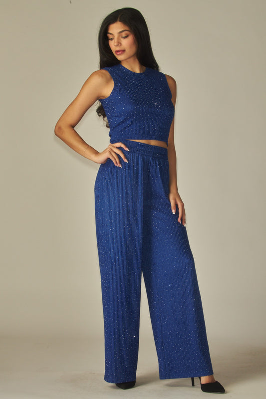 Our crinkled plisse rhinestone lounge wear set coordinates a sleeveless top and a wide leg...