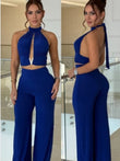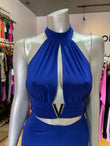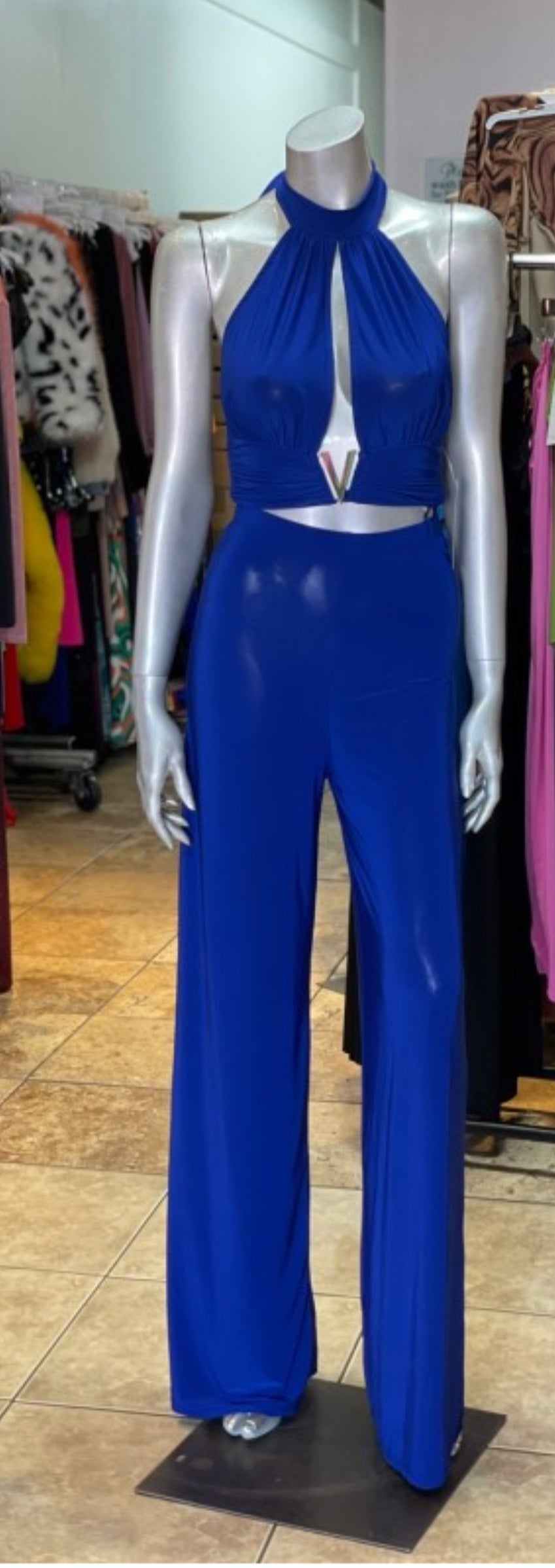 Royal Blue Halter Top featured cutout And matching wide leg pants,. PANTS SET, ROYAL BLUE. stretch material
