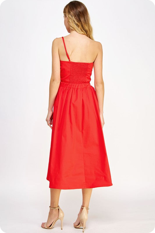 Knot twisted long dress in stretch twill fabric. This midi dress features an unique twisted and pleated bow at front, bodice with one shoulder construction with adjustable strap, smocking at back, midi A line skirt with elasticated waist at back, side pockets, and cut out at front.