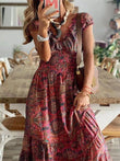Full Size Smocked Printed V-Neck Short Sleeve Dress