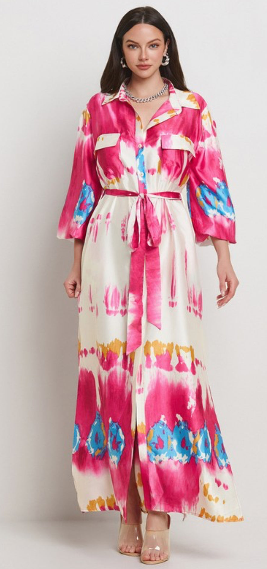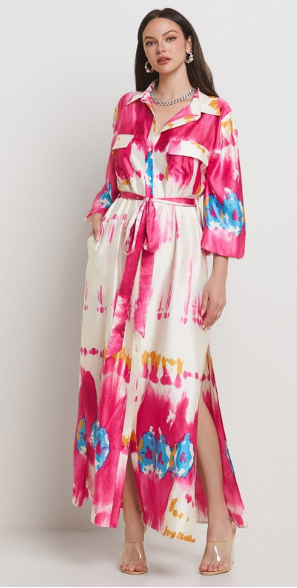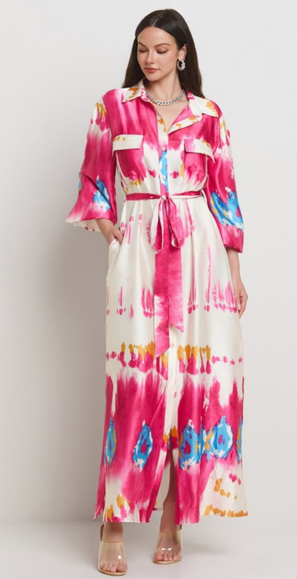 Multi colored button front side ski and belt attached Maxi Shirt Dress. Side Pockets. Ankle length, True to Size
